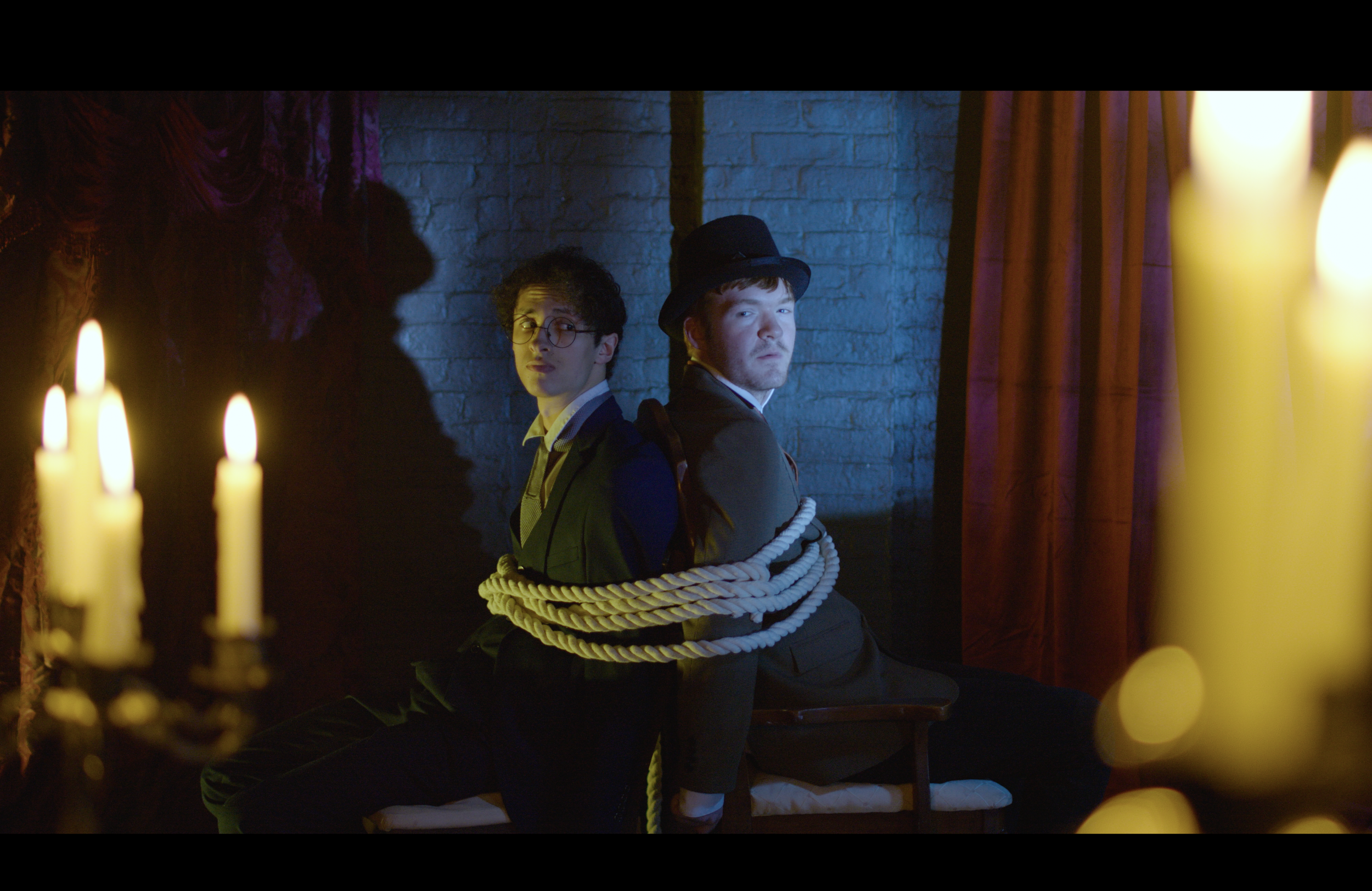 For the reverse shot, we used the brick wall in 601 as a back drop, brought up the two curtains and set up the candelabras in the foreground.