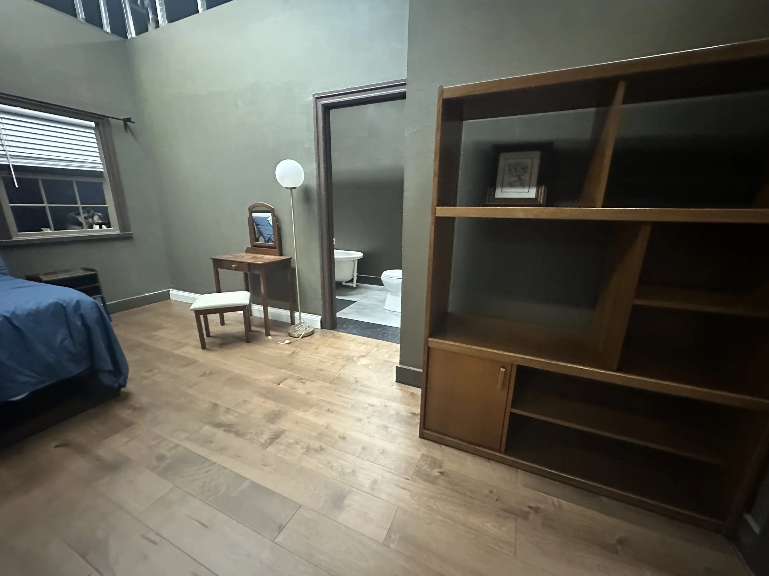 Studio 601 Features a kitchen, living room, bedroom and bathroom set.